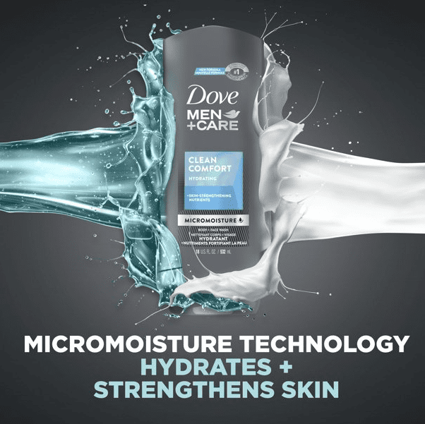 NEW FORMULA: Dove Men+Care Clean Comfort Body and Face Wash was developed for men’s skin. Our body wash features MicroMoisture Technology; plant-based cleansers; and skin-strengthening nutrients