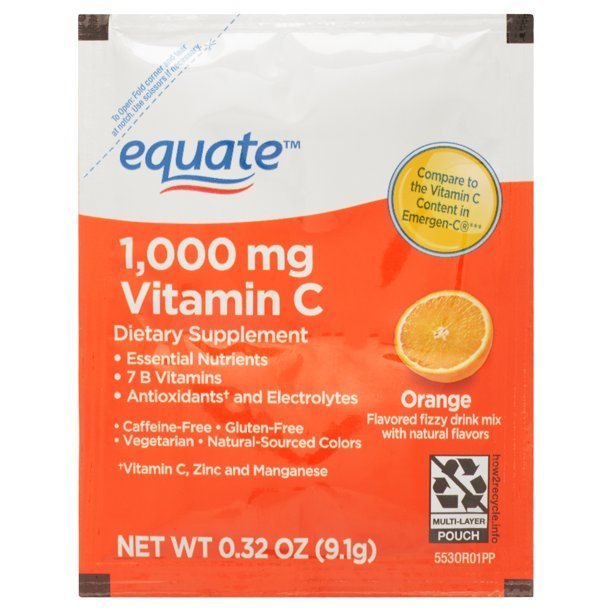 Equate 1000 mg Vitamin C Dietary Supplement Fizzy Drink Mix is a combination of essential nutrients in a delicious formula that comes loaded with 1000 mg of vitamin C per serving. It includes Vitamins C; B6; B12 and the mineral zinc; which aid in maintaining and supporting your immune system. Vitamin C; riboflavin and the minerals zinc and manganese sustain and support your multicomponent antioxidant system. For metabolism support; thiamine; riboflavin; niacin; vitamin B6 & B12 and pantothenic acid help convert food into energy. This fizzy drink is gluten free; vegetarian; and made with natural-sourced colors. Plus; it’s caffeine-free! Supplement your daily wellness routine with real fruit flavors and mix with 4-6 ounces of water for a fizzy; delicious drink mix loaded with a high dose of Vitamin C.