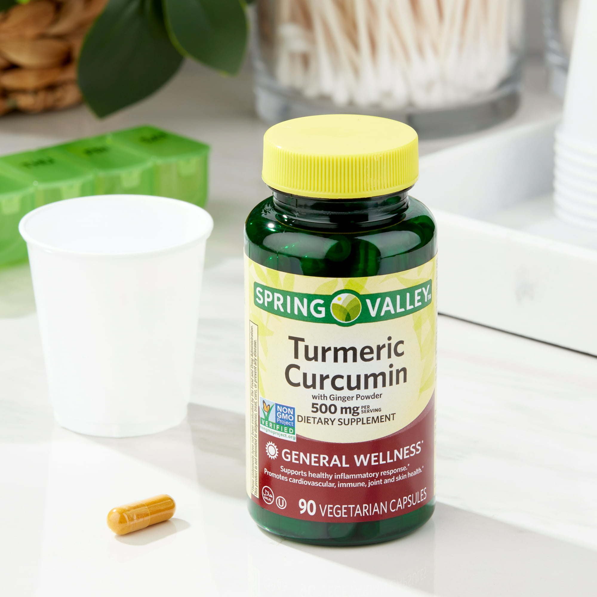 Spring Valley Turmeric Curcumin with Ginger Powder Dietary Supplement; 500 mg is a general wellness support supplement that promotes cardiovascular; immune; joint; and skin health; as well as a healthy inflammatory response. The suggested adult dosage is one vegetarian capsule daily; preferably with a meal. These capsules contain no gluten; yeast; milk and milk derivatives; lactose; soy; or sugar and are free of artificial colors or flavors. You can rest assured that Spring Valley Turmeric Curcumin with Ginger Powder Dietary Supplement; 500 mg is produced with strict quality guidelines and backed by our quality guarantee.